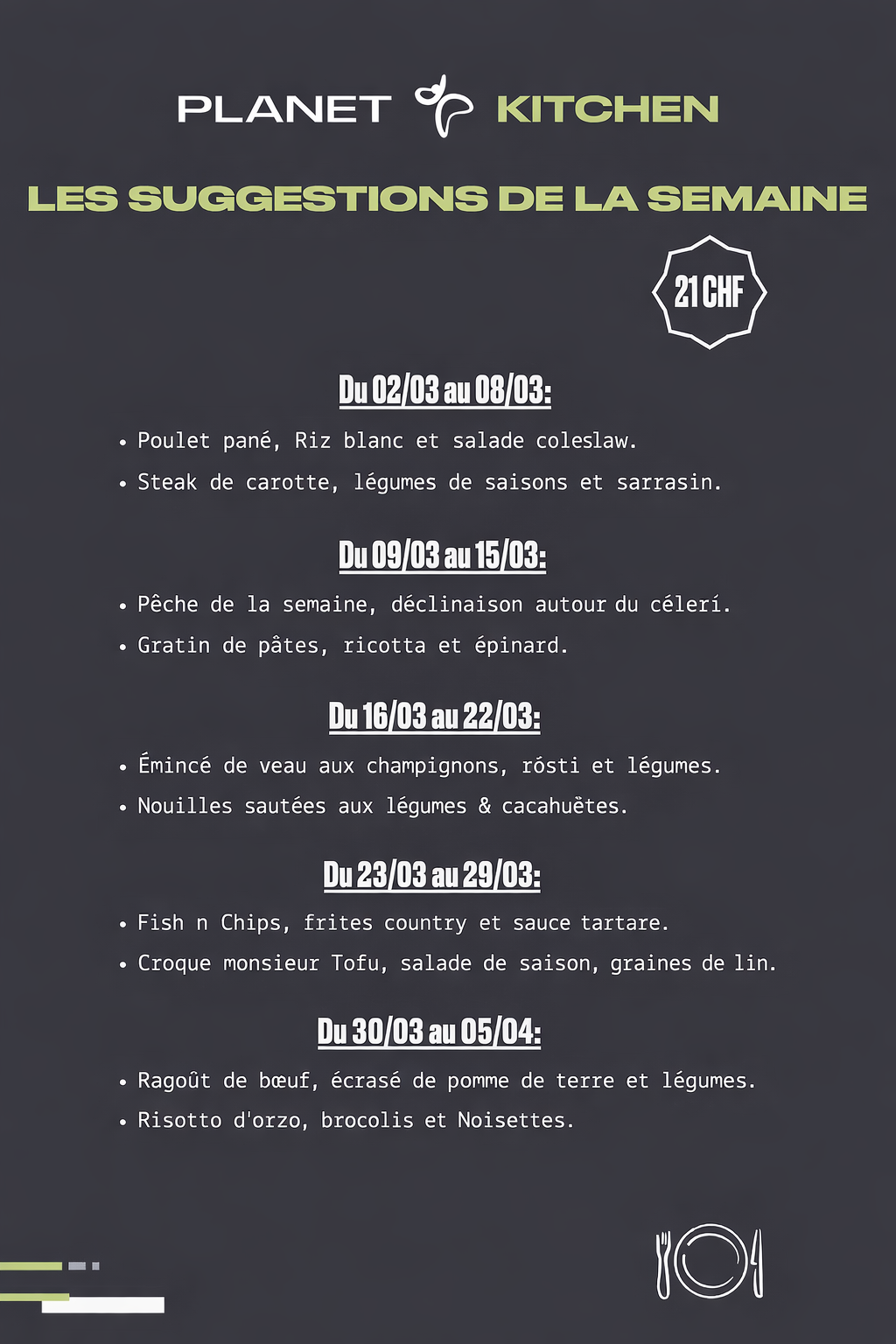 Retrouvez des plats équilibrés, sains et variés, à un tarif avantageux de 21 CHF. Une excellente occasion de découvrir de nouvelles saveurs tout en savourant une cuisine de qualité.